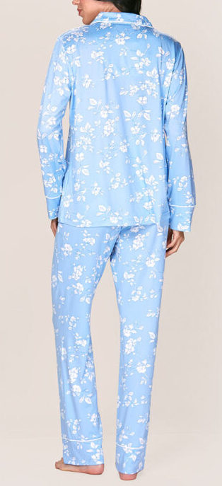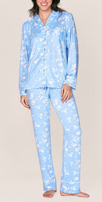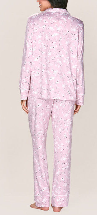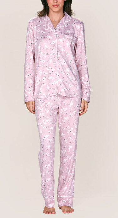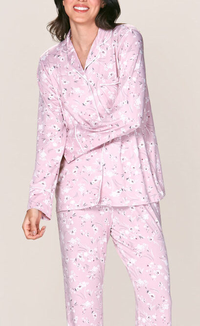 Pijama de dos piezas con delicado estampado floral. Camisa clásica con botones frontales. El pantalón incluye cinturón ajustable para mayor comodidad. Tela suave y liviana lo hace ideal para descansar en casa con estilo.