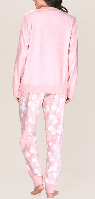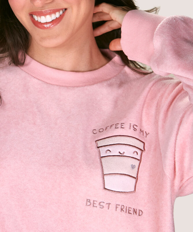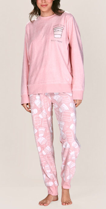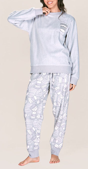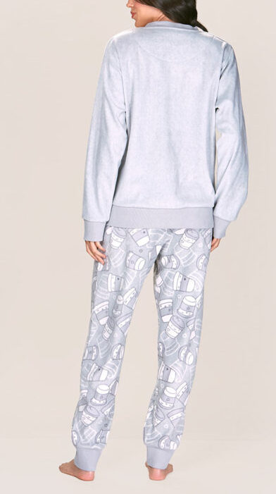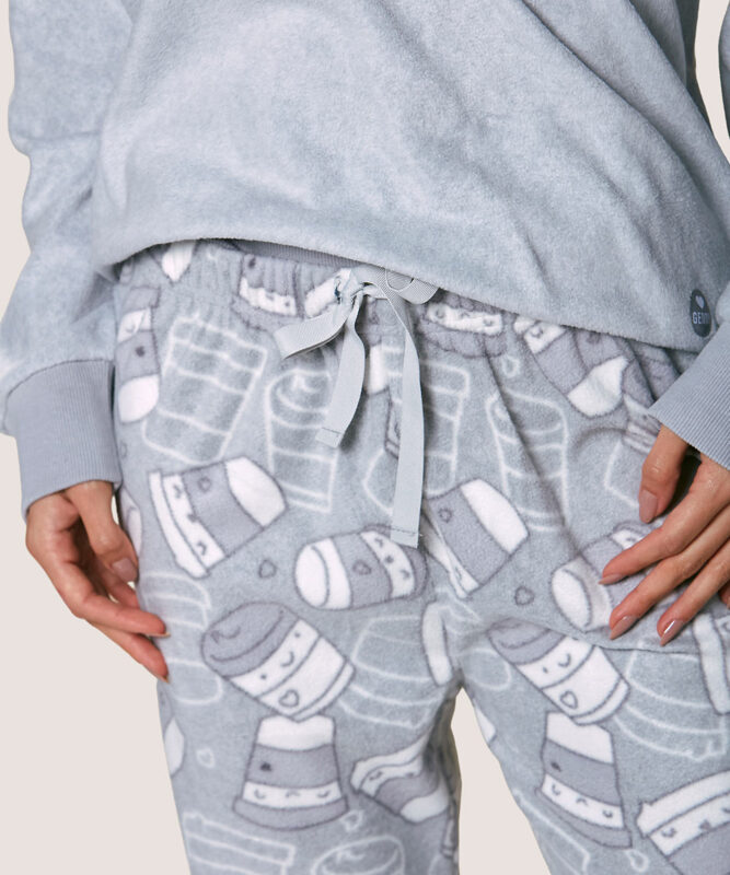 Pijama de dos piezas con diseño divertido de tazas de café en el pantalón y estampado minimalista en el pecho. Confeccionado en tela suave y cálida de micropolar, ideal para noches de descanso. Pretina elasticada con cinturón ajustable para mayor comodidad.