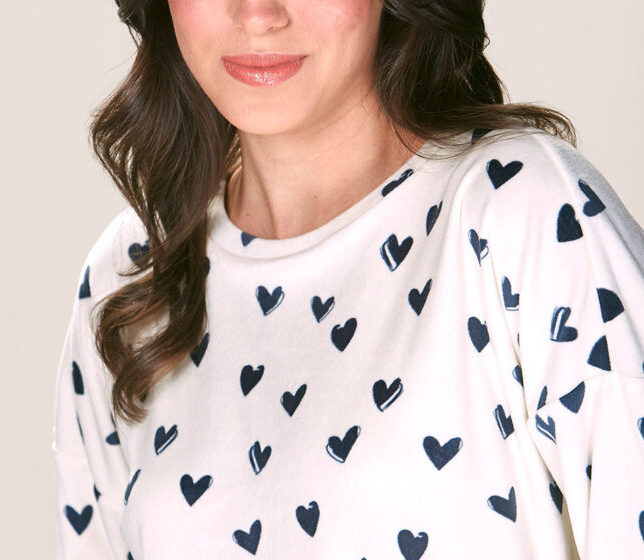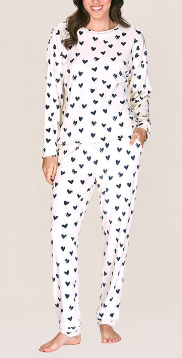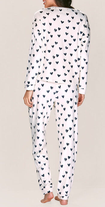 Pijama de algodón, color blanco con diseño full print de corazones azul marino. Suave, cómodo y perfecto para descansar o disfrutar en casa. Incluye pantalón con pretina elasticada y bolsillos laterales funcionales. Pijama a juego con nuestro pijama AJ-435